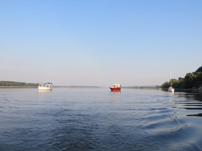 Ist lange her, aber wir schauen, wie ihr wisst, ja immer mal wieder rein... ![]() Wir haben 2012 / 2013 die Donau „gefahren“ und auch das eine oder andere Mal geankert. Mit einem Segler ist das speziell wegen des Tiefgangs immer etwas spannend... Hier mal ein Bild von unserem abendlichen Ankern im Strom (nein, nicht in der Fahrrinne...). Am schönsten ist immer der nuntergang...Wir waren zum Ende unserer Reise 3 Boote. Und so wie auf dem Foto haben wir am Abend geankert. Der Segler ganz rechts hatte nur einen Faltanker und keine Kette. Am nächsten Morgen war er weg.... ist aber noch gerade rechtzeitig wach geworden...Also mein Rat: Wenn Du auch mal im Strom Ankern willst, schaff Dir ein anständiges Ankergeschirr an - zumindest einen Plattenanker mit Kettenvorlauf . Den kannst Du genau so gut an Bord verstauen wie einen Klappanker.... Unsere Freunde mit dem roten Motorboot haben täglich (mehrfach) geankert - der Hund musste an Land.... Der Anker hat immer gehalten ![]() Grüße von der holländischen Grenze - Rainer