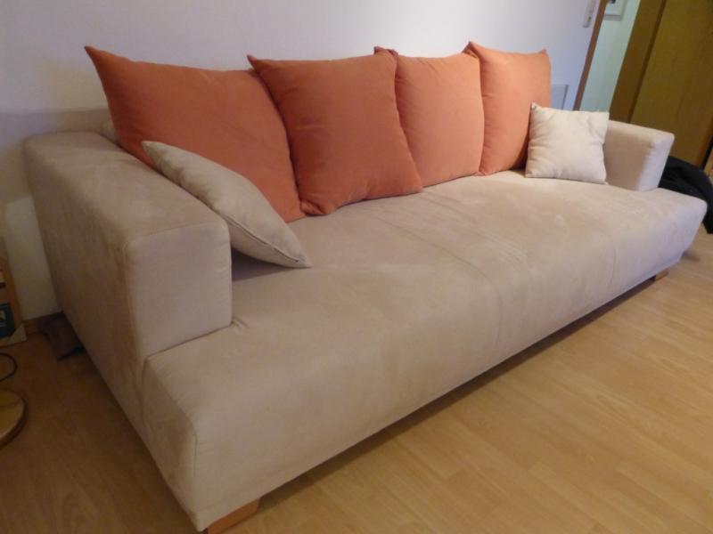 2,45 M breit, 1,10 tief, 0,60m hoch. Rücklehne umklappar. Mit Fach für das Bettzeug. Ohne Fehler.4 Jahre alt Aus beigem Microfaser, mit 4 Kissen Terracotta und 2 kleinen beigen Kissen.