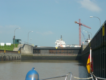 Hafen Leer- Leda, Seeschleuse, mitten in der Stadt und wieder Schiffneubauten.
