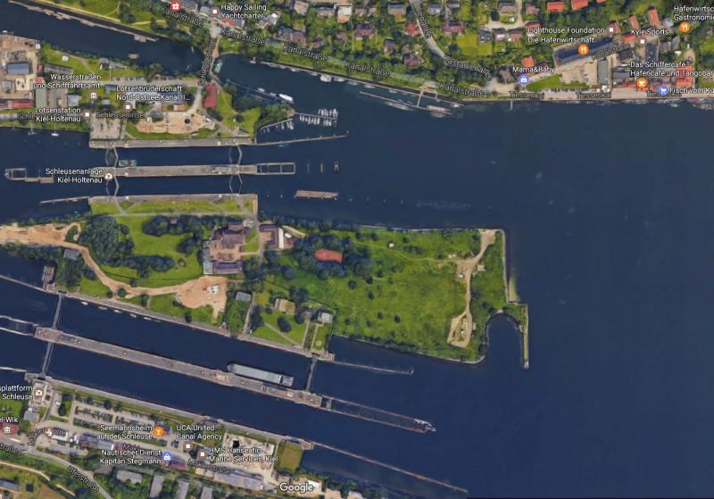 Wenn Du mit dem Auto zum NOK fährst, dann erst mal von Kiel Richtung auf die erste Brücke nach der Holtenauer Schleuse Richtung Schilksee B 503. Von der Brücke aus hast Du einen herrlichen Fotografierblick auf die Schleusenanlage und auf den Kanal. Dann fährst Du zur Strasse "Tiessen Kai" (früherer Ausrüster, Navi eingeben) direkt nördlich an der Einfahrt von der Förde her zu den Schleusen. Von dort zu Fuß zum kleinen Yachtanleger direkt neben den Schleusen. Von dort kannst Du direkt über das Schleusentor der nördlichen Schleuse auf die Schleusenmittelmole gehen, wo die Gebühren für die Sportschifffahrt erhoben werden und bist mittendrin im Geschehen. In den Kanal mit dem Boot nur wegen der Besichtigung einzuschleusen ist viel zu langwierig und kompliziert. Außerdem musst Du beim Ausschleusen bezahlen (z.Zt. wg Organisationspoblemen nicht, aber wie lange noch umsonst, weiß ich nicht). |
