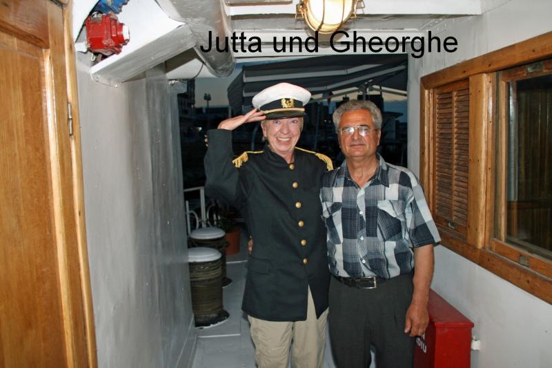 Wir können an der „Republica“ sogar Wasser bunkern. Aber bevor wir ablegen durften, musste Jutta unbedingt noch in Kapitän Gheorghe´s Uniform schlüpfen und zünftig grüßen.