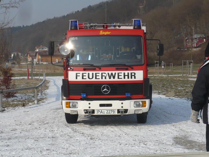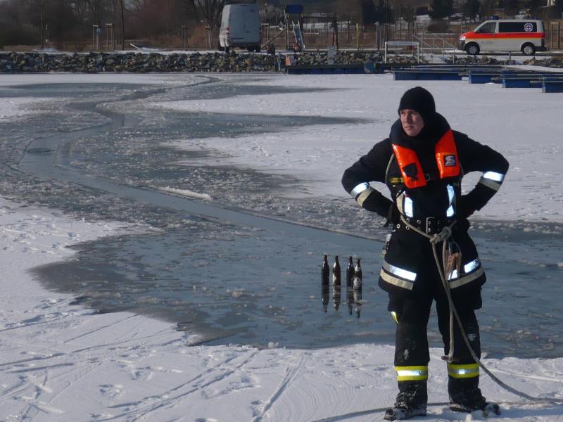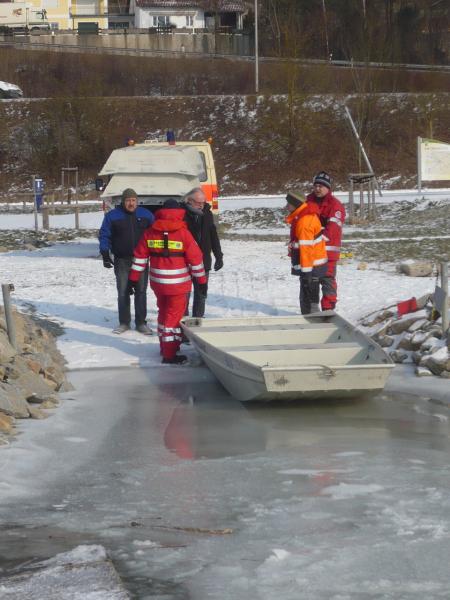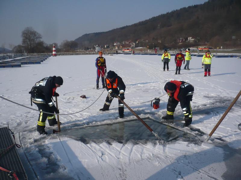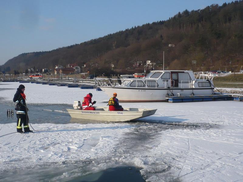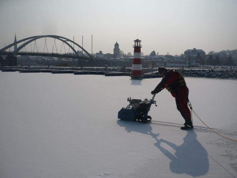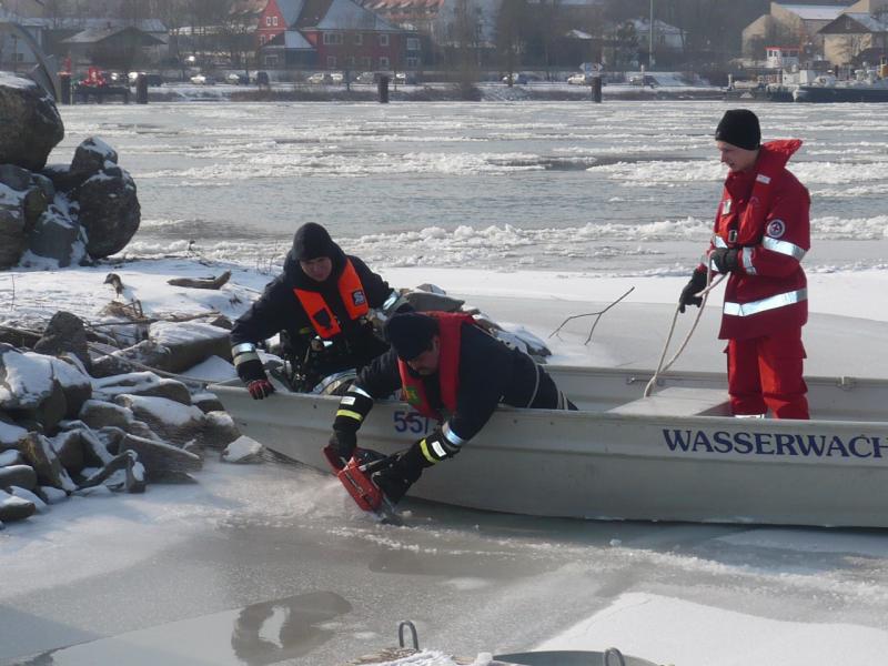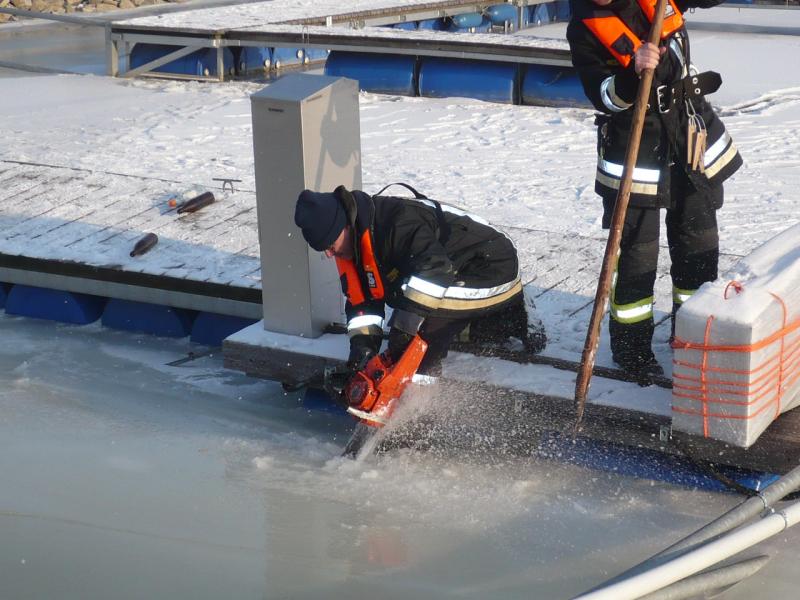 Die Scheerbäume sind schon verbogen wegen des Eises. Auch einige Stege sind beschädigt. Es war 28 cm Eis und das Wasser ist gestiegen.
