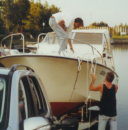 das war 2002 nach dem Kauf. Danach hab ich das Boot bis Ende 2006 gefahren und seitdem steht es in der Scheune. Diesen Winter kommt der IB raus und dann ist es spätestens 2012 mit großem AB wieder fahrbereit. ![]() Es wiegt laut Hersteller 2 t.