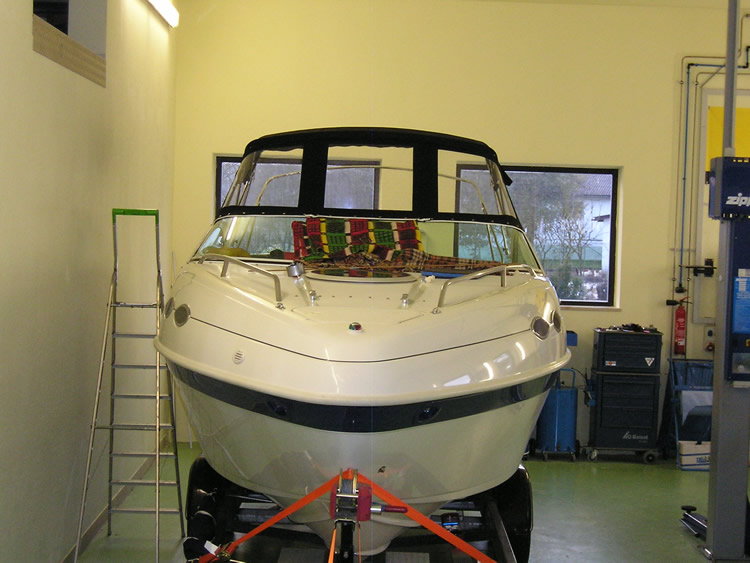 Biegeradius darf nicht zu groß und nicht zu klein sein, das Rohr muss oben ebenfalls eine leichte Wölbung / Rundung haben, die Abstände der Bügel maximal 75cm, die Ausleger dürfen nicht zu flach gestellt werden, damit der Stoff gespannt werden kann Wir hatten letztes Jahr einen Kunden, der unbedingt sein Gestänge für seine SeaRay selber machen wollte, war aus Mainburg. Haben wir dann 3x mit seinem Boot wieder heim geschickt, bis das Gestänge einigermaßen gepasst hat. Und war immer noch so, dass wir kräftig nacharbeiten mussten. Gespart hat der sich mit Sicherheit nichts mehr. Problem ist halt, dass das Gestänge einfach passen muss, damit wir sauber arbeiten können. Passt das Gestänge nicht, bekommen wir Riesenprobleme, die wir nicht lösen können, und wo unsere Arbeit dann auch nicht sauber ist - einfach weil die Grundlage gefehlt hat. Früher haben wir bei so manchem Verdeck so manche Gestängekröte geschluckt, mittlerweile werden vorhandene Gestänge entweder komplett geändert oder neu angefertigt und wenn der Kunde das nicht zahlen will, schicken wir ihn weiter ![]() PVC-Material wie auf den Fotos verwenden wir nicht, haben wir auch gar nicht hier, wir verwenden nur Stoffe im Verdeckbereich. PVC im Verdeckbereich wird gern geschweisst, die Ausrüstung dafür haben wir gar nicht. Und dann das Problem mit dem Arbeiten: das Boot ist wohl ein bisschen zu gross zum Trailern, oder? ![]() Im Wasser ist so etwas immer sehr schlecht zu machen, weil wir mit Teppichklebeband arbeiten: es darf kein starker Wind gehen, kein Regen, keine (sonst "schmilzt" das Klebeband und hält nicht mehr, etc.)Fragen über Fragen und Probleme ![]() ![]()