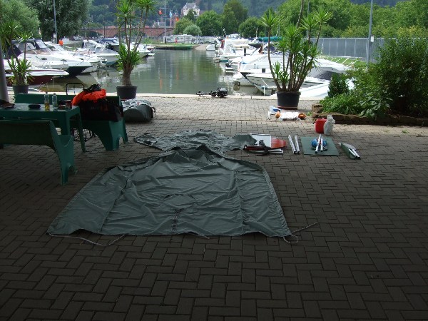Der Abbau: Schweinehitze, allein, dann doch alles handlich verpackt. Ab in die Stadt (natürlich gelatscht ...). Tagsüber legen hier die Hotelschiffe an, es wuselt nur so. Und Schlag 18:00 sind alle weg, Miltenberg klappt die Bürgersteige hoch, Sendepause. Auf der Strecke zwischen Faust und Zipf's haben weniger als 5 Kneipen Plätze im Freien.