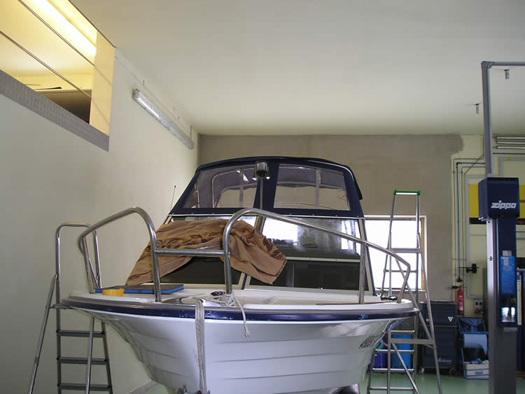 ![]() Bei diesem Boot erreichen wir fast auch die maximale Spannweite von 1,50m, bei 1,60 ist dann Schluss, da ist der Abstand Bügel-Bügel zu gross - wir würden massive Probleme mit der Stoffspannung bekommen. Du kannst den hinteren Bügel wegmachen, wenn er dich stören würde (von der Optik her) und im Boot verstauen, oder einfach stehen lassen, denn er ist fest abgestützt. Oder du nimmst nur die Seitenteile raus, dann hast du ein großes Bimini über die gesamte Länge - das Hinterteil bei diesem Verdeck ist allerdings nur hochrollbar, nicht rausnehmbar. Wollte er nicht haben, weil er es nicht braucht. So hat er eben die "Wurscht" hinten dran, wenn er hochrollt. Olaf wollte es auch nicht haben ![]()