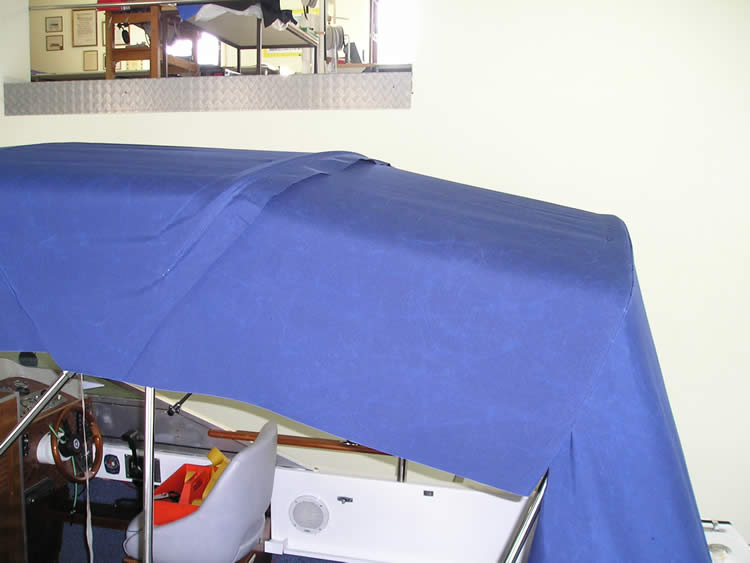 Zuerst nochmal brav kontrollieren, ob auch alles faltenfrei und stramm sitzt (die Verdeckoberteile sind jetzt schon so stramm wie Trommeln, ohne dass wir alles schon zu 100% montiert haben), dann das Hinterteil montieren. Danach kommt dann allerlei "unnützes" Beiwerk und Kruschelarbeit: Überlappungen stecken, Klett anzeichen, RV vom Hinterteil und die Scheibe festlegen) Genauso wie dann die seitliche Form vom Oberteil, nach der dann der überstehende Stoff weggeschnitten wird. Es muss jetzt alles mehr oder weniger fertig gemacht werden, dass der letzte Schritt dann vorgenommen werden kann: Anfertigen der Seitenteile