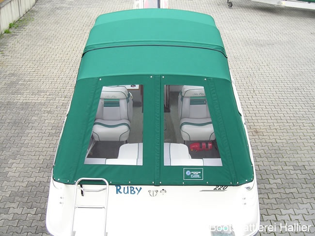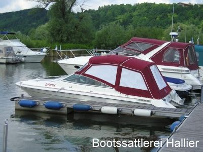 Ideal wäre es nämlich, wenn der Gestängebügel im 45° Winkel in die Naht hinten drückt, aber das geht fast nie, da mit meisten seitlich noch aussteigen können wollen. Also muss der Bügel steiler gestellt werden, damit wächst aber die Gefahr, dass er nach vorne rutscht. Bei der SeaRay unten hat es ohne Abstützung perfekt gepasst, da wir den hinteren Gestängebügel an die Abstützung von vorne anschlagen durften, Kunde wollte es so und wir haben es gerne gemacht - denn das Oberteil wurde dadurch absolut perfekt, man sieht keine, wirklich keine auch nur noch so kleine Falte im Oberteil. Aber so etwas geht eben nicht immer. Mit dem Verdeck würde ich mich auf jede Messe trauen. Kunde ist aus dem Boote-Forum, war einer der ersten, der über den Internetauftritt zu uns gekommen ist, leider nie mehr was von ihm gehört.
